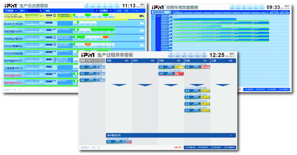 生產(chǎn)異常看板;生產(chǎn)全局進(jìn)程;車間設(shè)備負(fù)載動態(tài)展示